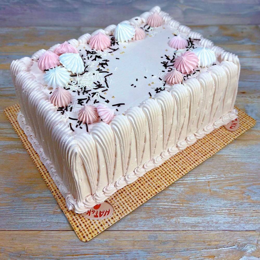 Бисквит, 2 безе с орехами и прослойка крема глессе, взбитые сливки с эффектом мороженого.