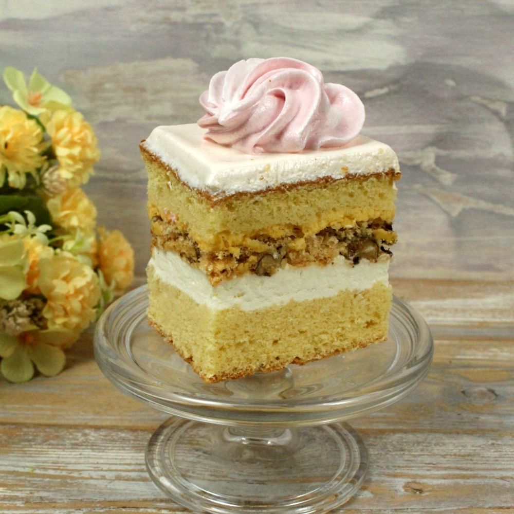 Бисквит, 1 безе с орехами,прослойка крема глессе, взбитые сливки с эффектом мороженого.